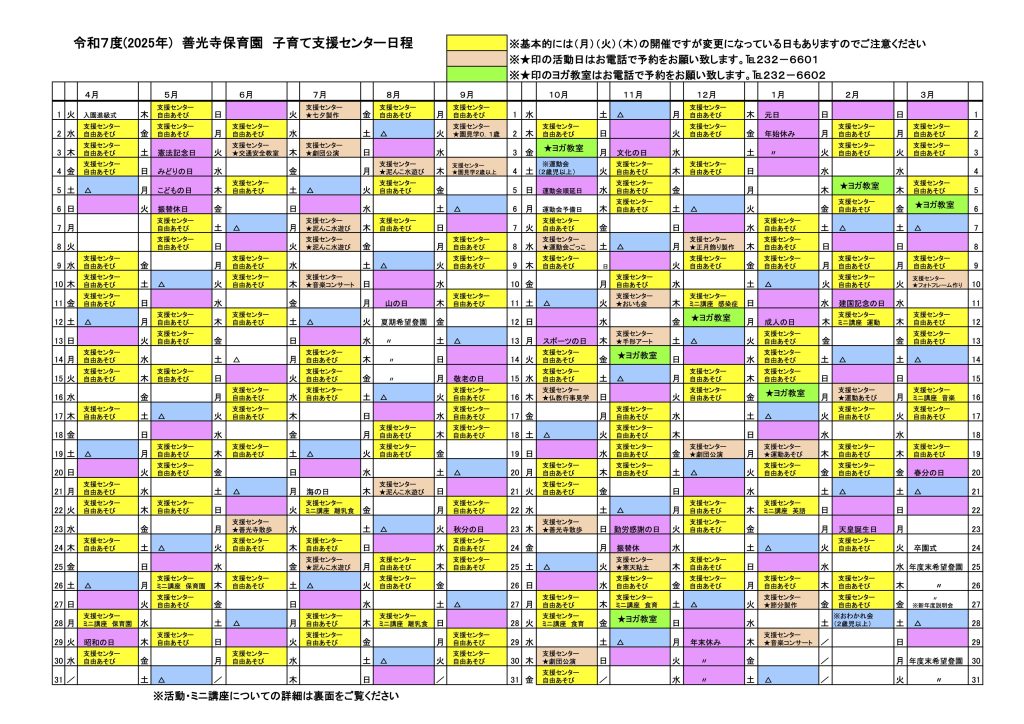 保護者様へ 子育て支援センター日程表を掲載しました 2025年7月18日 zenkoji-hoikuen 子育て支援センター情報を以下よりご覧いただけます。・令和7年度年間予定表・支援センターの詳細と活動日・ミニ講座日程表 ※資料をクリック(タップ)するとダウンロードが可能です。
