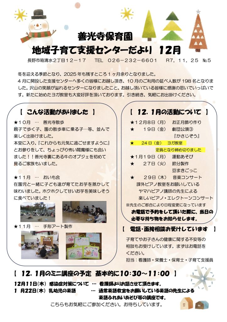 保護者様へ入園ご希望の方へ 子育て支援センターだより(12月号) 2025年11月20日 zenkoji-hoikuen 最新の「子育て支援センターだより」を以下よりご覧いただけます。※資料をクリック(タップ)するとダウンロードが可能です。