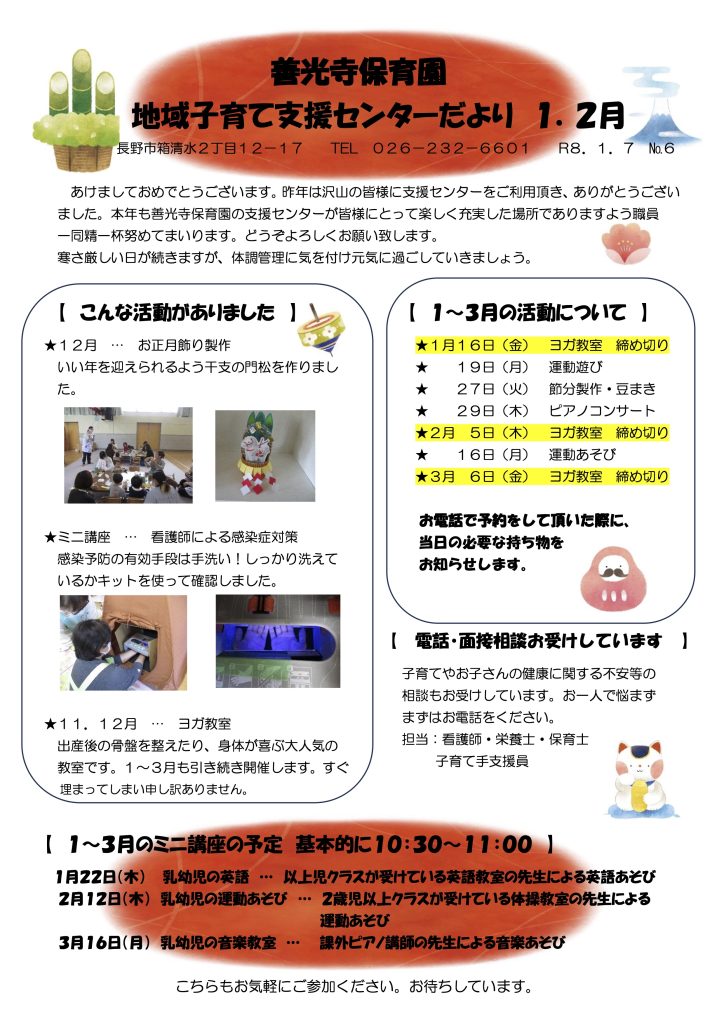 入園ご希望の方へ 子育て支援センターだより(1・2月号) 2026年1月5日 zenkoji-hoikuen 最新の「子育て支援センターだより」を以下よりご覧いただけます。※資料をクリック(タップ)するとダウンロードが可能です。