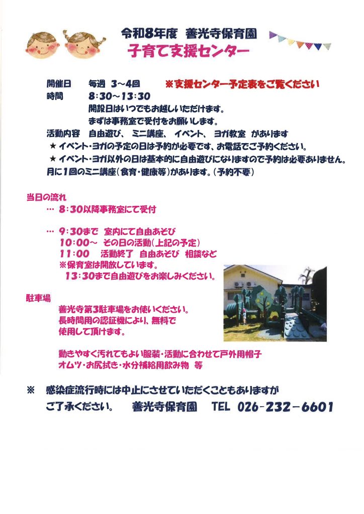 保護者様へ 【令和8年度】子育て支援センターのご案内 2026年3月1日 zenkoji-hoikuen 子育て支援センター情報を以下よりご覧いただけます。※画像をクリック(タップ)して詳細をご確認ください。 <子育て支援センター情報(5ページ)>・令和8年度子育て支援センターご案内・ミニ講座日程表・イベント予定表・ヨガ教室のご案内・子育て支援センター年間予定表